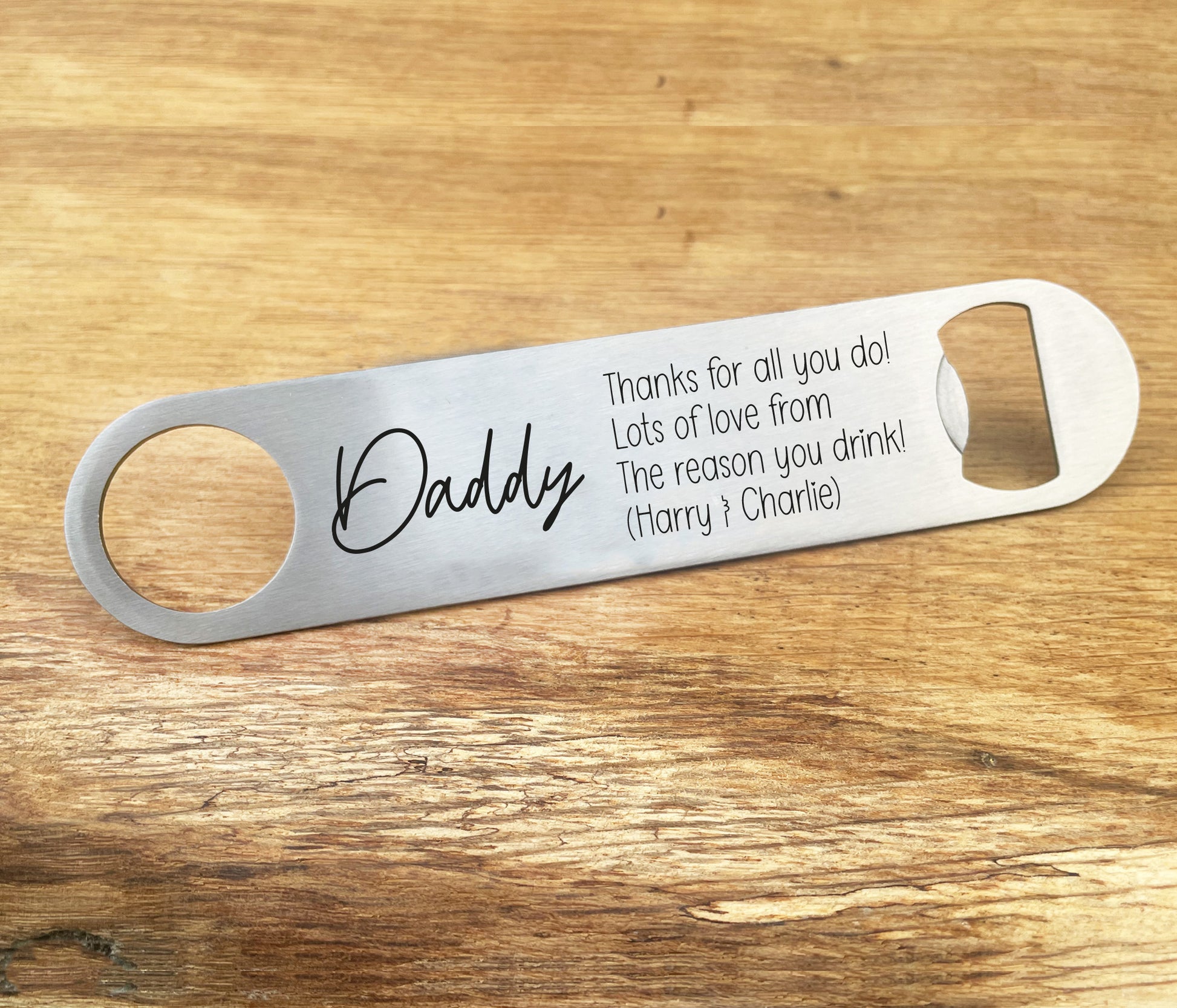 This personalised Daddy bottle opener is a great gift for daddy with a funny message 'love the reason you drink' and your children's names.