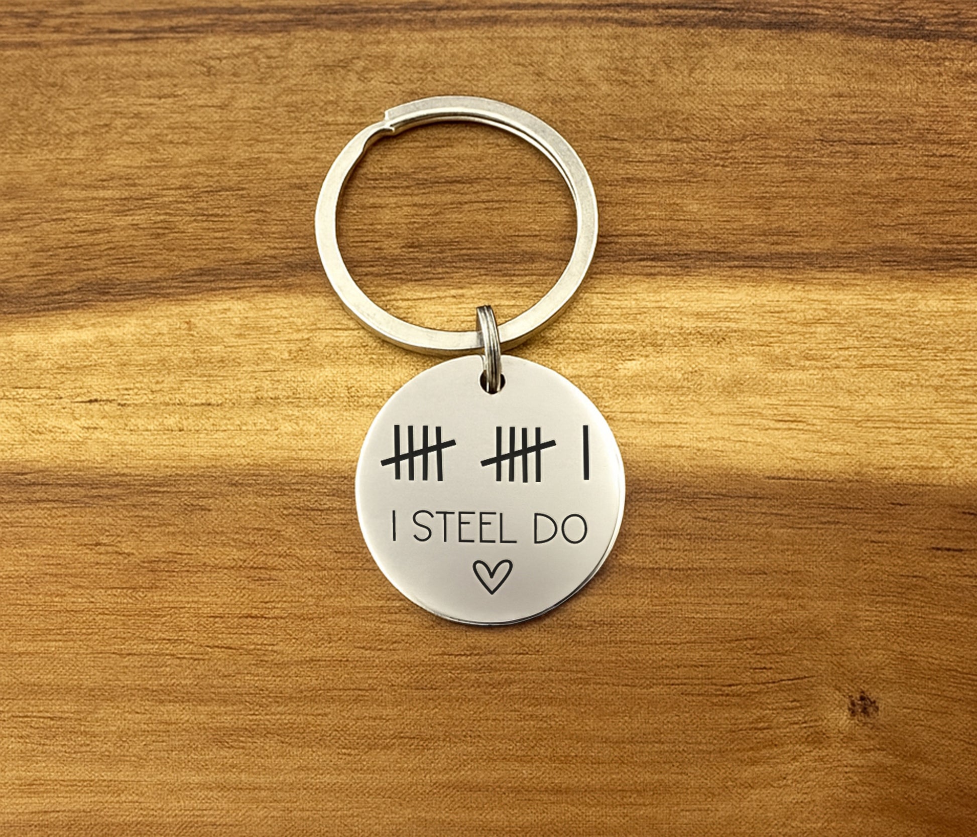 This keyring is engraved with a tally of 11 and the wording 'i steel do!' and personalised with your initials on the back. The keyring is a nod to the traditional 11th wedding anniversary which is steel.