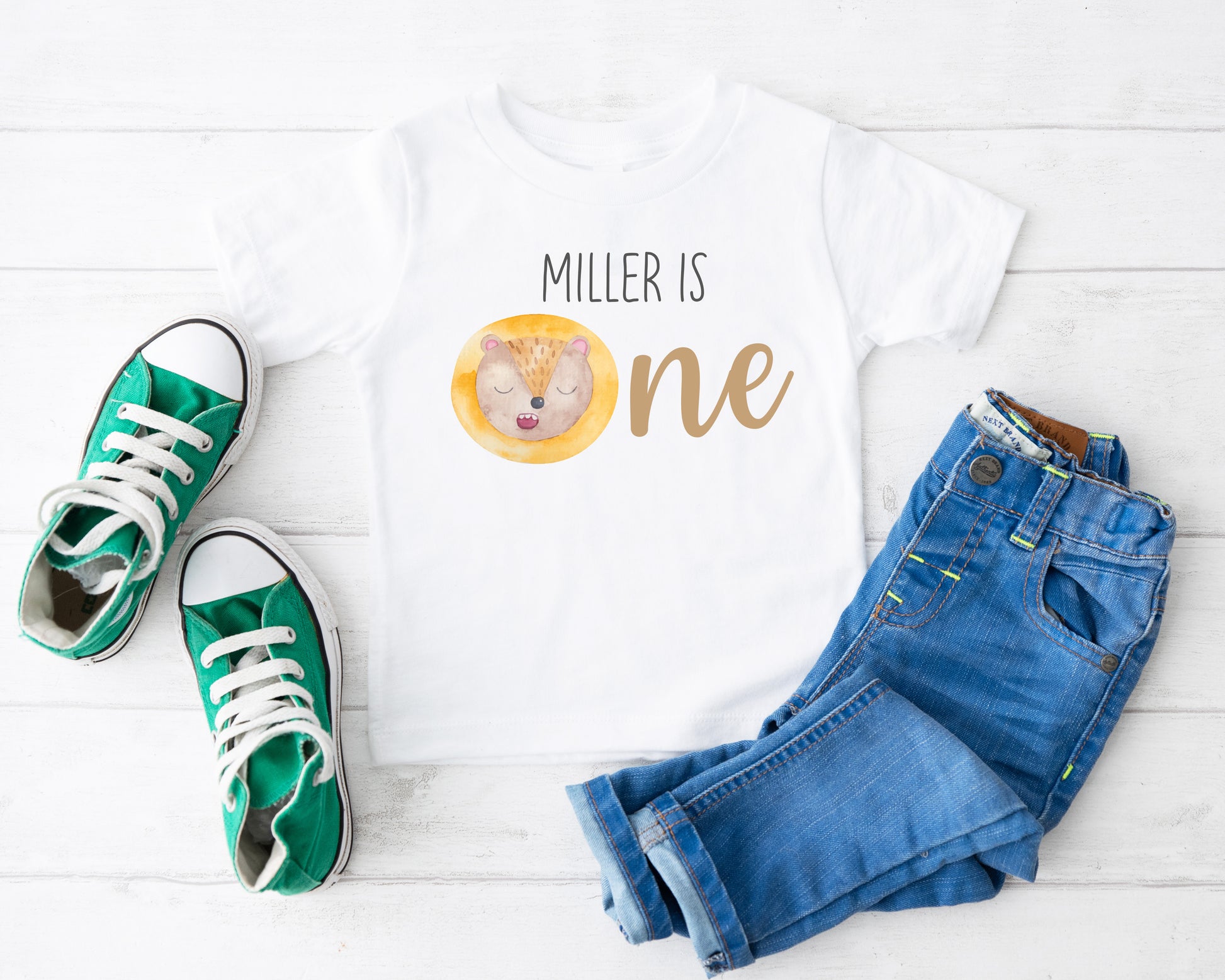 The tee is printed with the little one's name and the wording is one, with the O from one being replaced with a lions face.